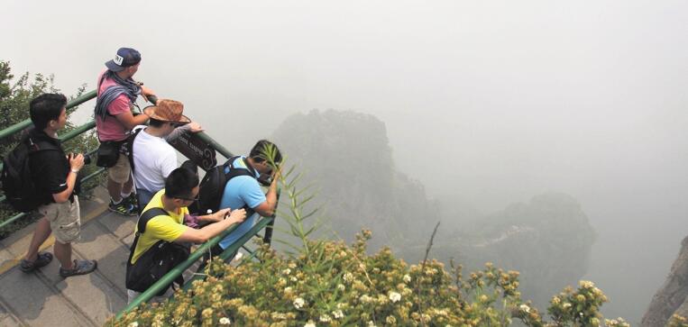 Tourists take a view of the Taihang Mountains on top of the main peak of Wangmangling. WANG ZHUANGFEI / CHINA DAILY