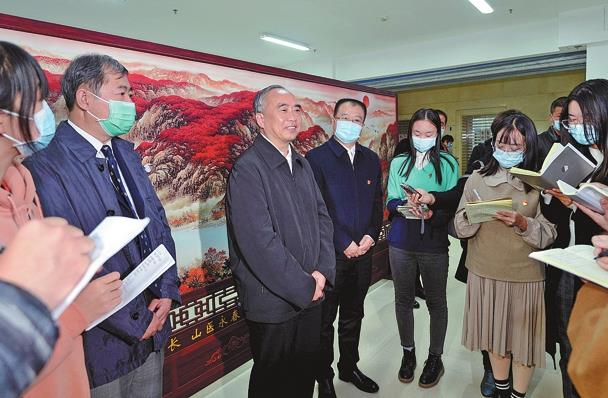 Lin Wu (third left), governor of Shanxi, shares his understanding of the plenary session with teachers and students at Shanxi Medical University in Taiyuan.LI ZHAOMIN / FOR CHINA DAILY