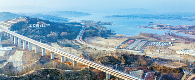 The TaiyuanZhengzhou HighSpeed Train passes Yunzhu Lake, a renowned tourist attraction in Yushe county.ZHANG JIONG / FOR CHINA DAILY