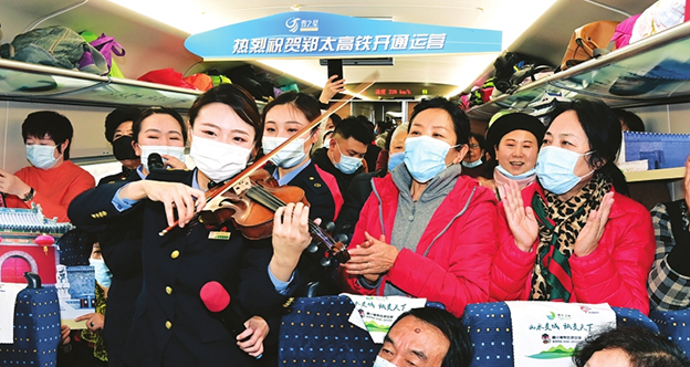 A staff member plays the violin to entertain passengers on the train. LIU TONG / FOR CHINA DAILY