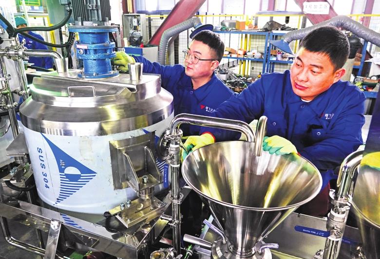 Mechanics check dairy production machines at a food machinery company in Taiyuan. LIU TONG / FOR CHINA DAILY