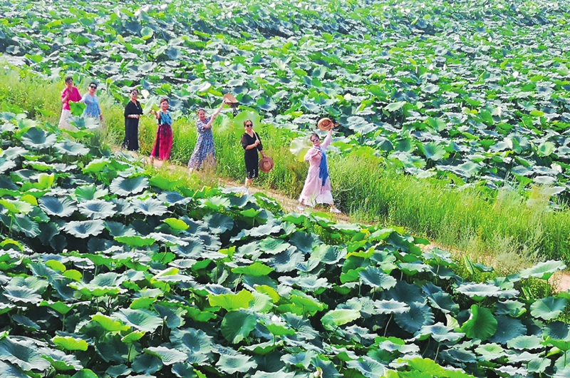 8月15日,游人在萬榮縣廟前村黃河灘涂的萬畝荷塘觀荷賞花。當日正值周末,運城、萬榮休假的游客有序來到荷塘游玩。近幾年來,萬榮縣委、縣政府以黃汾高質量發展為契機,新建了1萬多畝的連片荷花塘,并搭建了多處高層觀景臺,筑起了四通八達的賞荷、拍照小道。既建成了生態綠洲,又促進了鄉村觀光旅游的大發展,帶動周邊村民增收,助力鄉村振興。李克榮攝