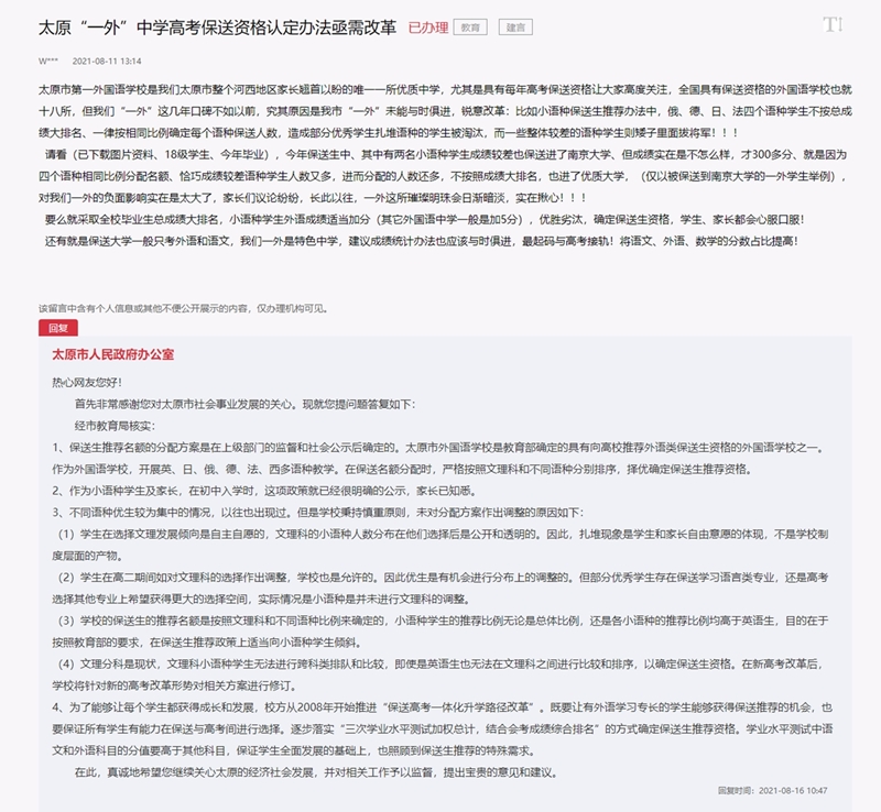 近日,有網友在人民網領導留言板給太原市市長張新偉留言:“太原‘一外’中學高考保送資格認定辦法亟需改革……”對此,太原市人民政府辦公室在回復中表示:“經市教育局核實:太原市外國語學校是教育部確定的具有向高校推薦外語類保送生資格的外國語學校之一。作為外國語學校,開展英、日、俄、德、法、西多語種教學。在保送名額分配時,嚴格按照文理科和不同語種分別排序,擇優確定保送生推薦資格!