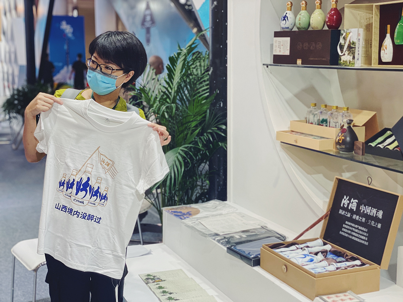 一旁,浙江杭州的溫女士和好友則對一件汾酒文化T恤愛不釋手。她表示,汾酒作為國酒老字號源遠流長,也深受家中父輩喜愛。
