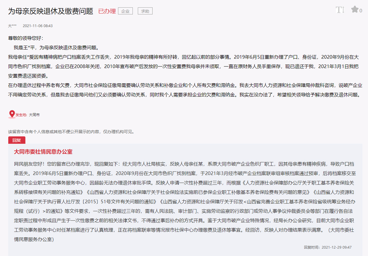 2021年12月29日,大同市委社情民意辦公室對網友王先生在人民網“領導留言板”上替母親反映的“破產企業原員工因病延誤辦理社保繳費及退休”問題作出回應。經多方聯動,目前王先生反映的問題已得到解決。