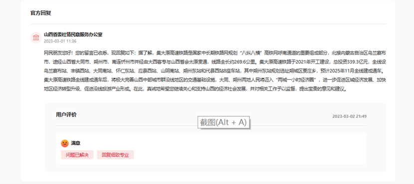 收到留言后,山西省委社情民意服務辦公室回復稱,集大原高速鐵路于2021年開工建設,總投資339.3億元,全線設烏蘭察布站、豐鎮西站、大同南站、懷仁東站、應縣西站、山陰南站、朔州東站、代縣西站8座車站,其中朔州東站規劃選址為朔州市朔城區賈莊鄉,預計2025年11月全線建成通車。