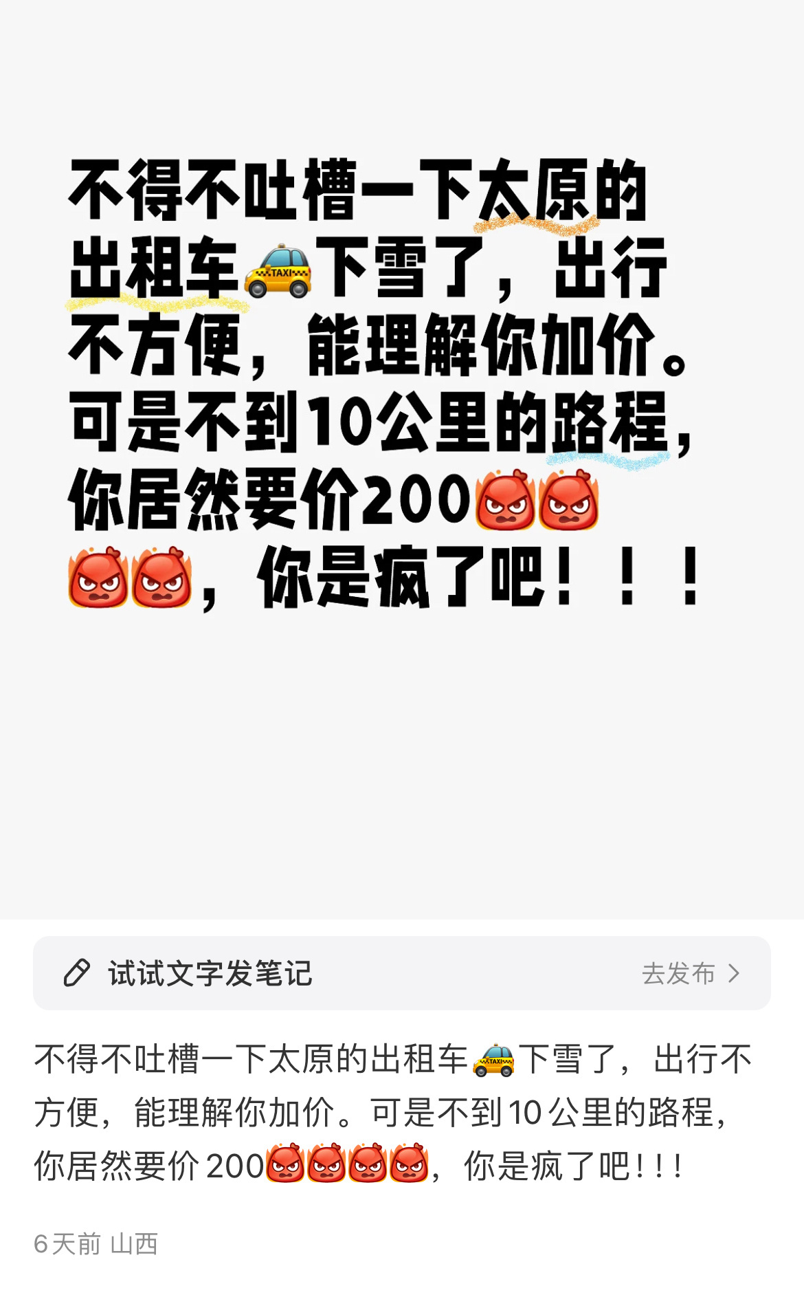 前文說過,應對暴雪掉鏈子的還是部分出租車。在太原感受很深,暴雪幾日,少數出租車漫天要價、部分黑車趁機高價拉客,發災難天氣財。