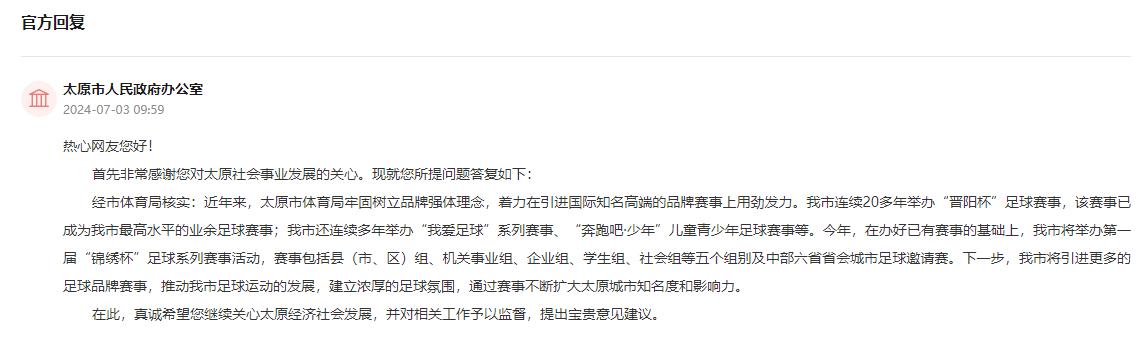 針對留言,太原市人民政府辦公室進行了回復,對網民提出的建議表示感謝。據介紹,近年來,太原市體育局牢固樹立品牌強體理念,著力在引進國際知名高端的品牌賽事上用勁發力。