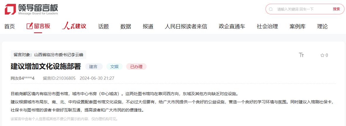 人民網太原7月10日電(田小麗)“目前堯都區有臨汾市圖書館、城市中心書房,但這兩處圖書館均在河西方向,東城及其他方向缺乏相應設施?!苯?,網民通過人民網“領導留言板”給臨汾市委書記留言,建議根據城市布局在臨汾市東、南、北、中均設置配套圖書館文化設施。