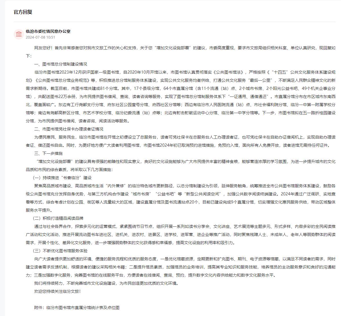 回復中,臨汾市文旅局介紹了臨汾市圖書館總分館制建設情況。作為國家一級圖書館,臨汾市圖書館自2020年10月開館以來,積極推進總分館制服務體系建設,實現公共文化服務均衡供給、打通公共文化服務“最后一公里”,不斷滿足人民群眾的精神文化需求。