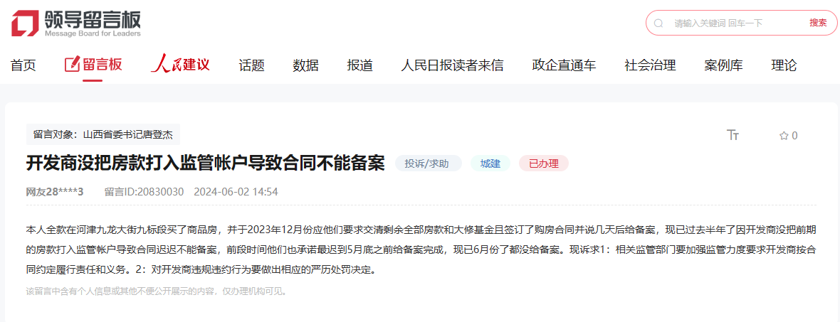 據了解,該網民在河津市九龍大街全款買了商品房并于2023年12月簽訂了購房合同。但半年多過去了,由于開發商未把網民已交付的購房款打入資金監管賬戶,導致購房合同無法備案?!百彿亢贤瑐洳涣税?,我們就沒法辦不動產證!”6月5日,網民情急之下通過人民網“領導留言板”留言求助。