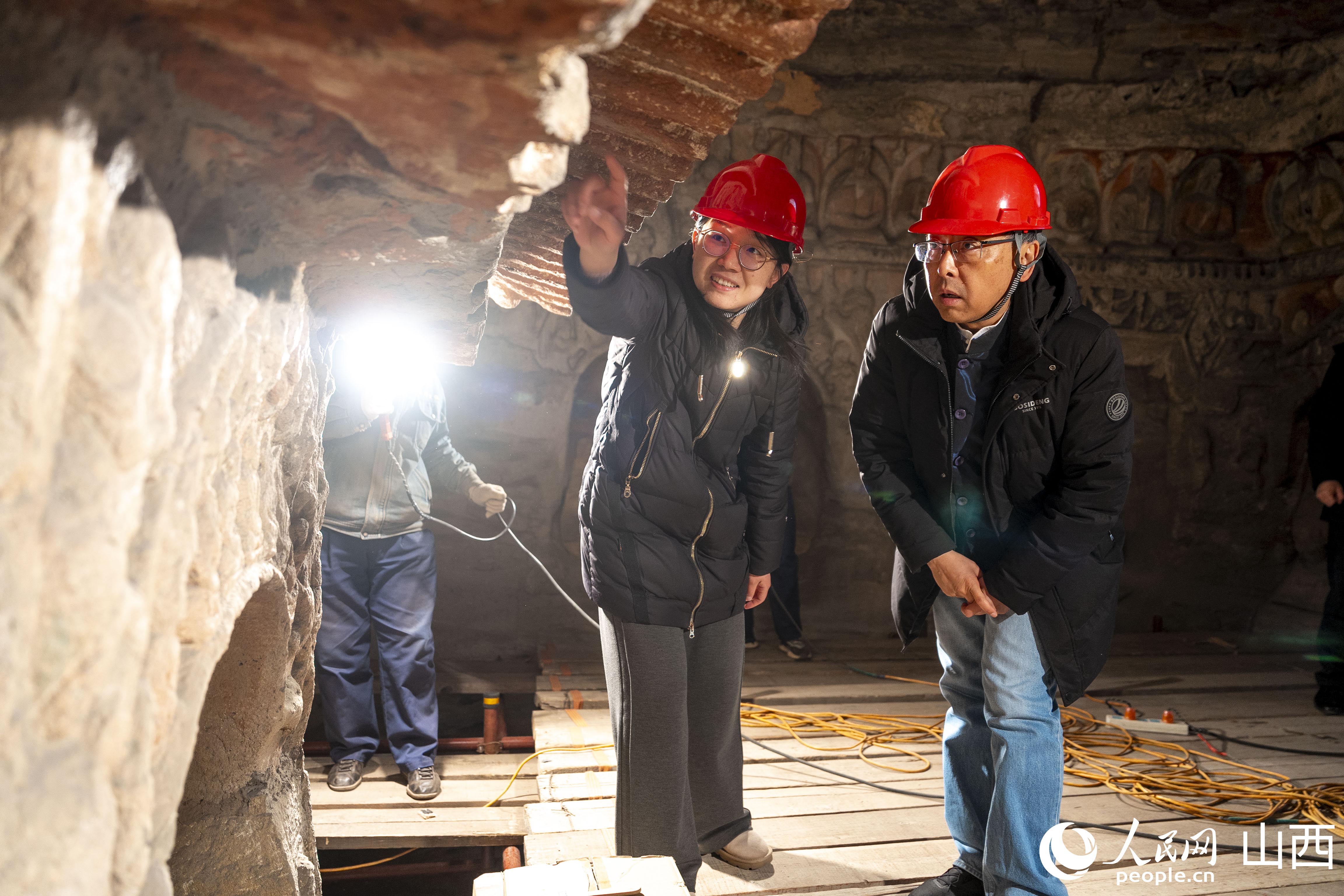 2月26日,杭侃在云岡石窟1號窟與同事探討文物保護措施。人民網 盧鵬宇攝