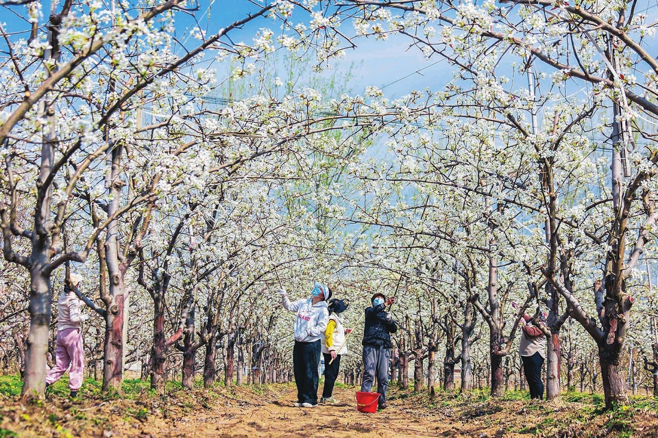 3月30日,鹽湖區龍居鎮6萬余畝的紅香酥梨進入盛花期,農民們抓住短暫的開花期,加緊對盛開的梨花實施人工授粉,確保紅香酥梨品質,實現豐產增收。姜樺攝
