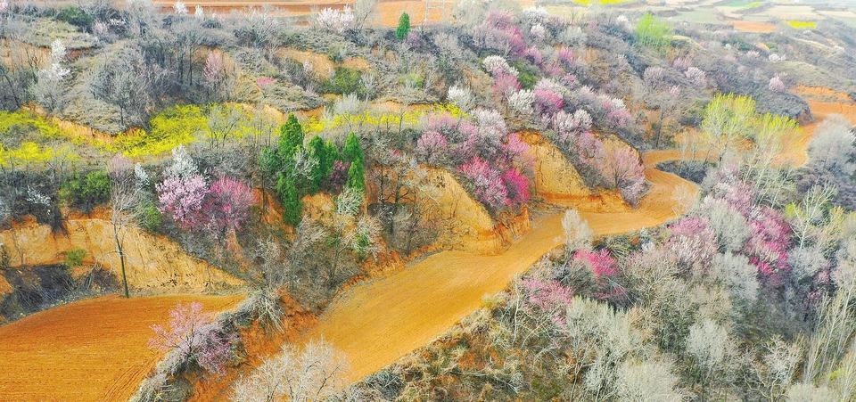 3月31日,夏縣瑤峰鎮山區,層層梯田與爛漫山花相互映襯,構成一幅絢麗斑斕的生態圖畫,美不勝收。張秀峰攝