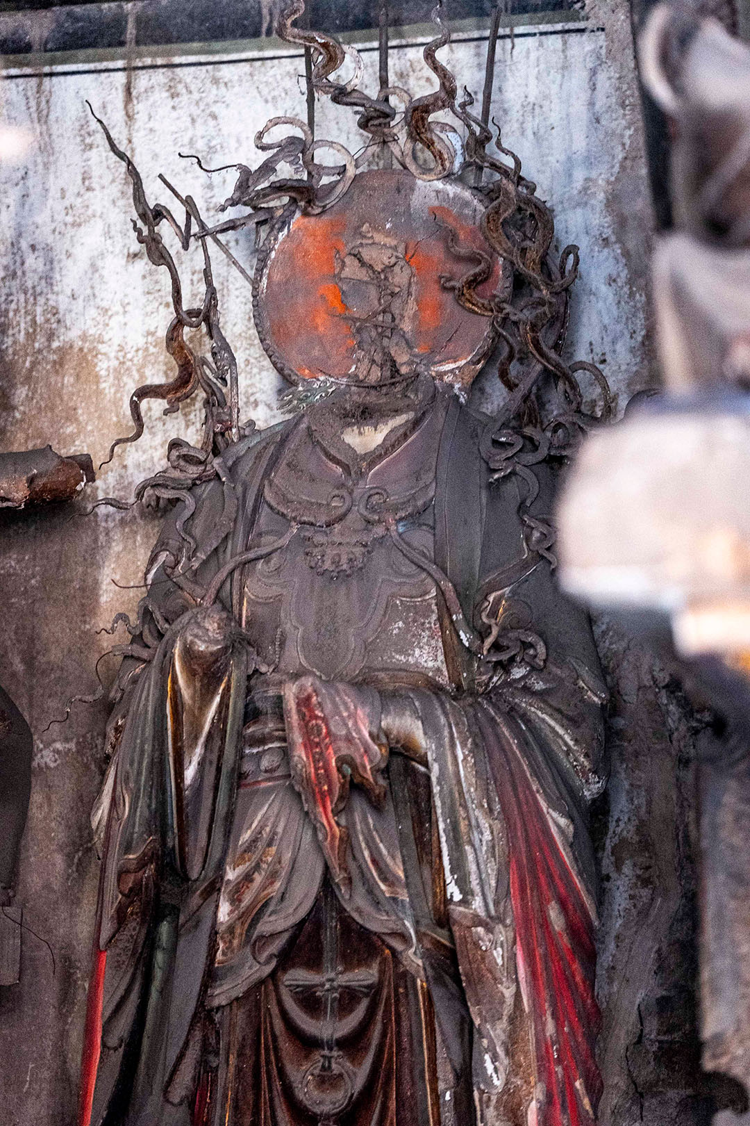 所有造像中最令人驚嘆的,當屬位于西側北起第十二處(B12)的崇寧天(關公)。此尊造像為中年武將形象,赤紅的面部,胡須采用真實的毛發進行鑲嵌,頭頂卷翅金鏊,飾火焰紋頭光,飄帶繞肩腹而下,身著金甲胄,披長袍,腰系玉帶,沙魚尾護襠口,腳蹬云頭履,身軀微傾,袖口后飄,充滿動感。整尊彩塑神態莊嚴,挺身侍立,威風凜凜。