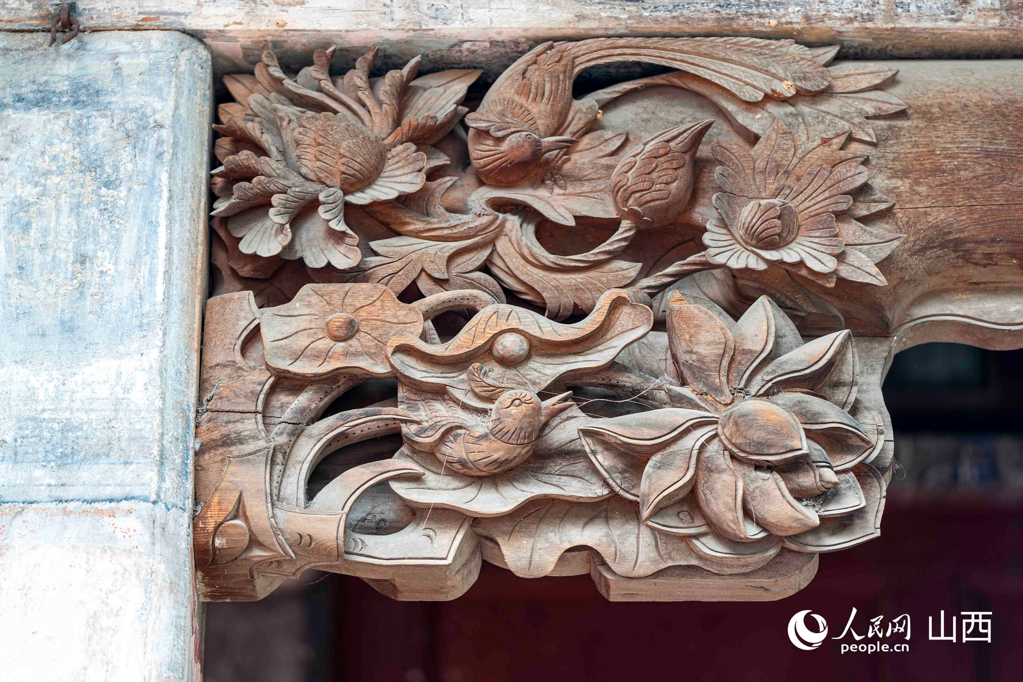 正殿臺基石雕陡板保留“元至正四年”紀年,印證其始建年代。殿內主體梁架呈現明代風格,五架梁與三架梁精密咬合,前檐八根方柱四角混棱起線,柱頭雀替通間雕花縱向聯絡,耍頭斫成龍首形,形成剛柔并濟的力學體系。后墻兩根元代石柱直抵脊槫,柱頭斗拱保留《營造法式》中“材分八等”的宋金遺風。踏道兩側殿基石上淺浮雕刻著“蓮花童子”“鳳凰牡丹”“神話故事”等圖案。