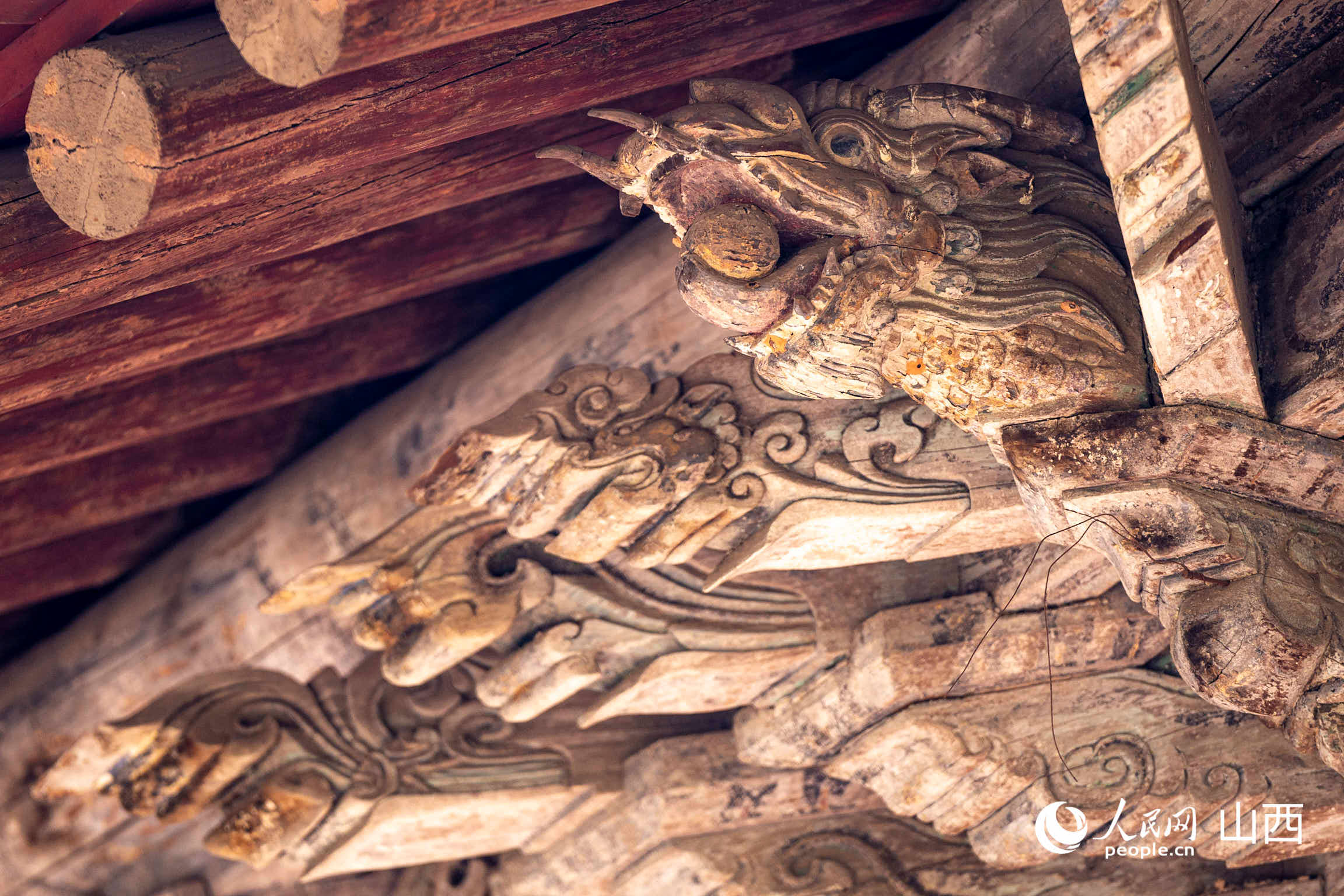 移步近觀,前檐石柱底部四面浮雕瑞獸與威嚴獸首,明代獅頭柱礎四角為獅頭咬幾腿,幾腿內雕刻獅子滾繡球造型,暗合“鎮守廟門”的營造寓意,經500年風雨仍清晰可辨。仰首可見懸山頂兩側的垂脊瓦作,滴水檐端“福壽”字樣瓦當與明代原構琉璃脊筒相映,將宋元遺風與明清規制熔鑄于同一時空坐標。