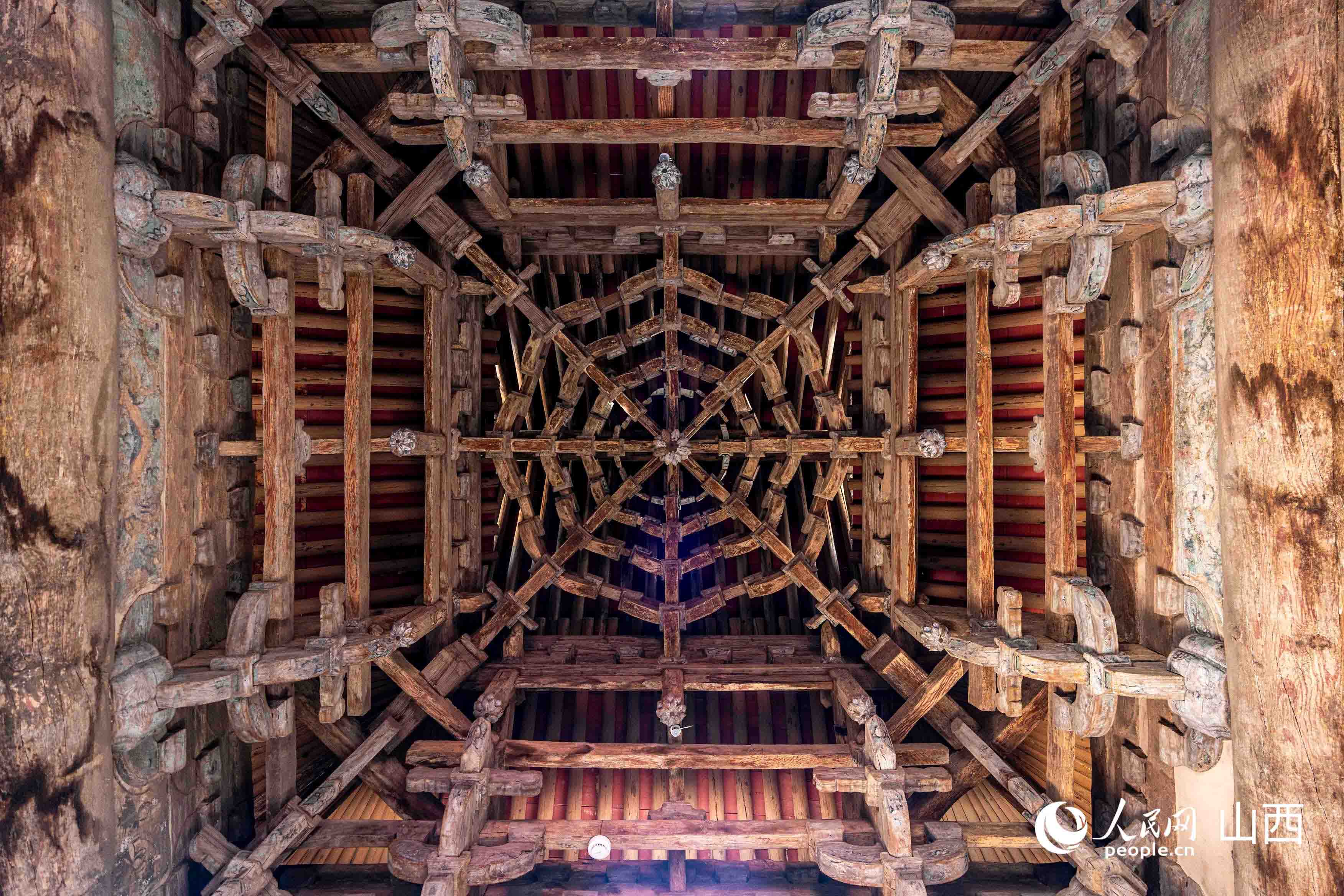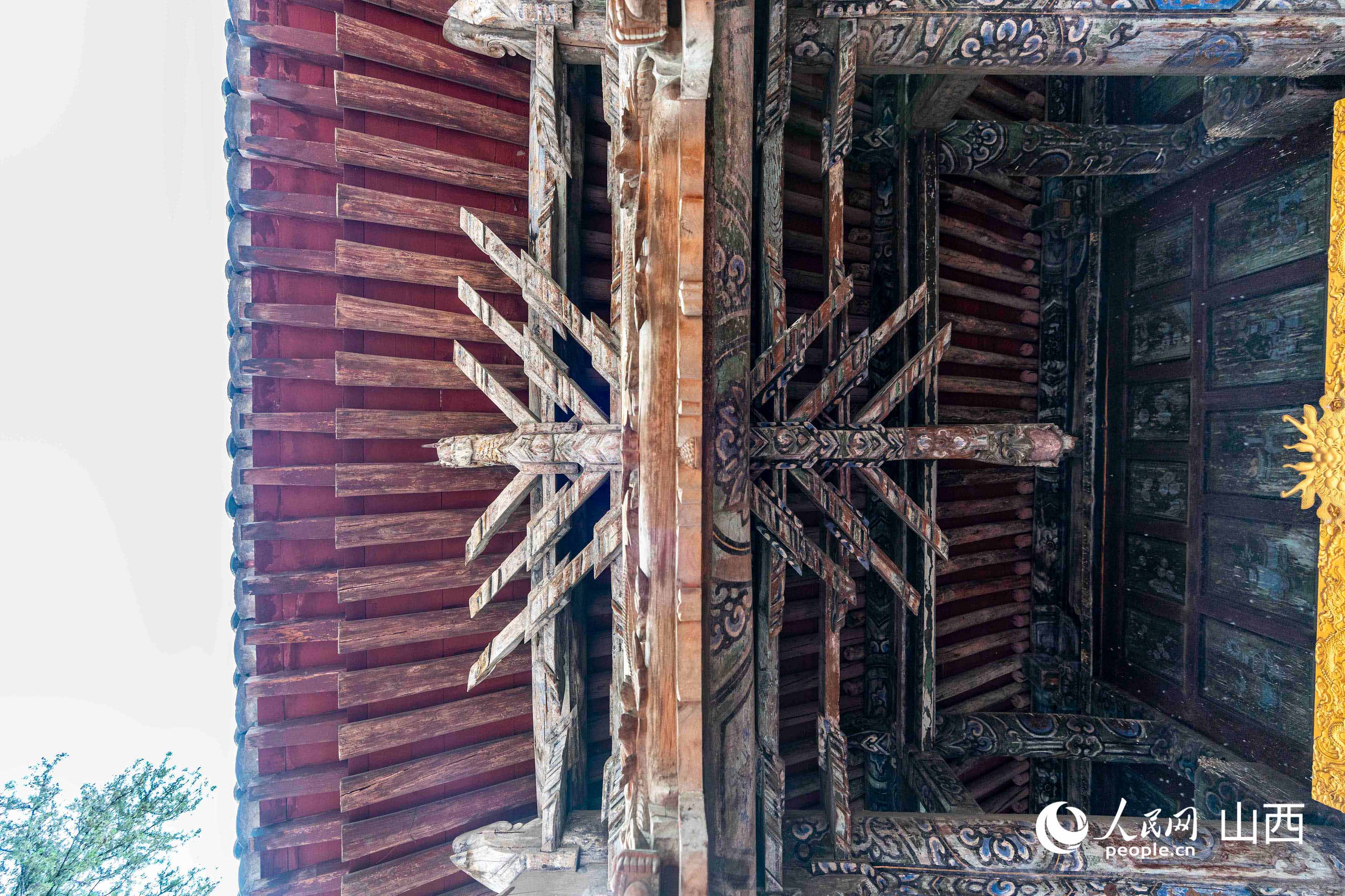 無梁殿,正如其名,最大的特色就在于完全摒棄傳統梁架,采用“以木代梁”的懸挑技術。殿內藻井如蓮花垂懸,八層斗拱以45度斜栱交錯疊澀,中心垂蓮柱直抵四柱頂端。這種“以木代梁”的營造手法,既規避了傳統梁架“頭重腳輕”的力學缺陷,又通過穹頂結構增強戲曲聲學共鳴。