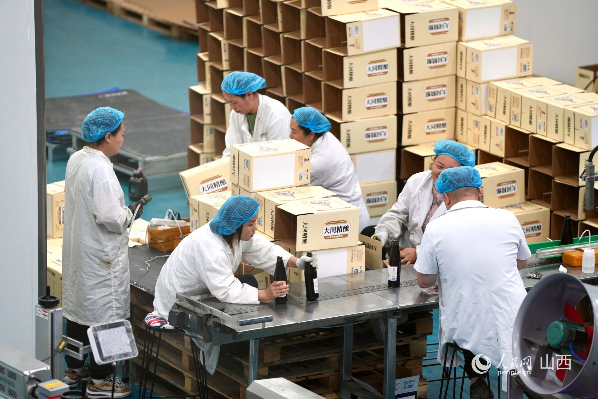 大同三利集團生產車間內,工人正在分裝黃花啤酒。人民網 盧鵬宇攝