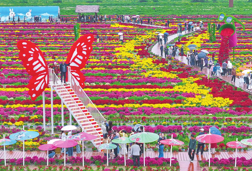 十月四日,游客在芮城縣學張鄉斜口村觀賞菊花。近年來,當地積極發展“菊花+旅游”產業,通過種植觀賞菊、加工菊花茶、開發文創產品等舉措,提升產品附加值,帶動旅游業發展。(常奇攝)