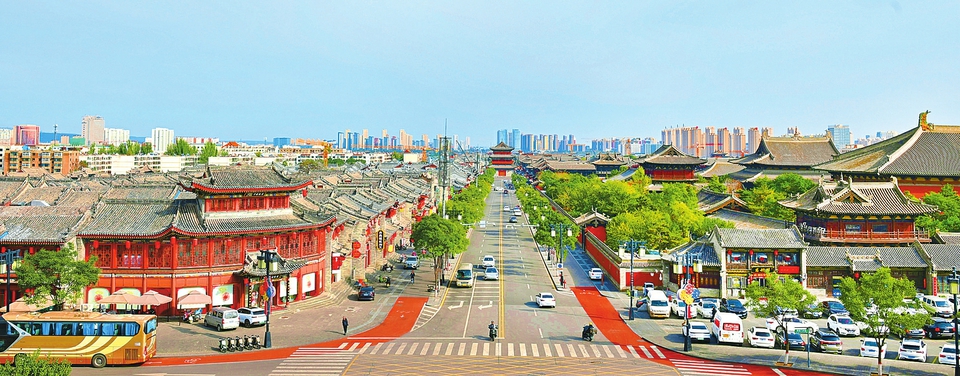10月20日,俯瞰大同古城,古樸的樓閣錯落有致,與遠處的現代化建筑相互映襯,展現出這座千年古都深厚底蘊和時代活力。(記者楊晨玉攝)