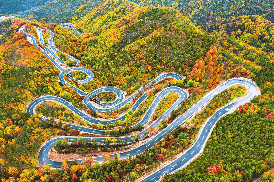 近日拍攝的左權縣太行龍泉風景區景色。太行一號旅游公路北天池段,似長龍盤旋在五彩斑斕的太行秋色之中,峰回路轉,風景秀麗,繪成一幅絕美的天然畫卷,帶領游客開啟詩意之旅。(邢蘭富攝)
