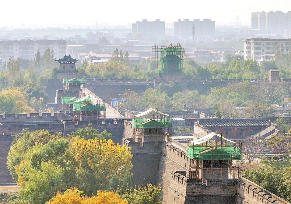 10月28日,平遙古城東城墻展開修繕作業。此次修繕是對現存72座敵樓進行房面防水保護工程,采取分段實施、封閉作業的方式,最大程度減少對游客的影響。(梁生仁攝)